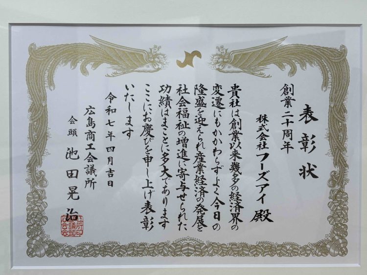 このたびフーズアイは、創業20周年という節目の年に、「広島商工会議所 開設永年継続企業表彰」を受賞いたしました。